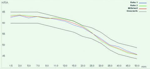 在下一步中,试样必须固定好,且在硬度试验过程中不得移动。相对于端面以指定的间隔执行前8个HRC测试点:1.5 – 3 – 7 – 9 – 11 – 13 – 15 mm。之后,每隔5mm设置一个测试点。硬度结果在试样长度上用图表表示。这就产生了一条硬度变化曲线,从中可以比较钢的淬透性或读取有效硬化深度。